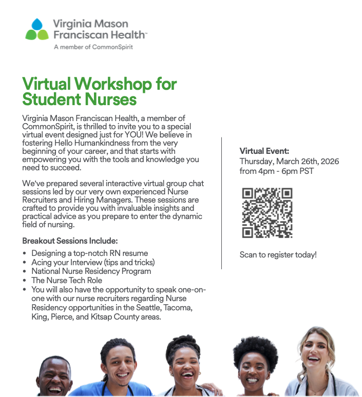 On behalf of Virginia Mason Franciscan Health, a member of CommonSpirit Health, we are excited to invite your junior and senior nursing students to attend our upcoming Virtual Nurse Resident Workshop on March 26, 2026, from 4-6 p.m.