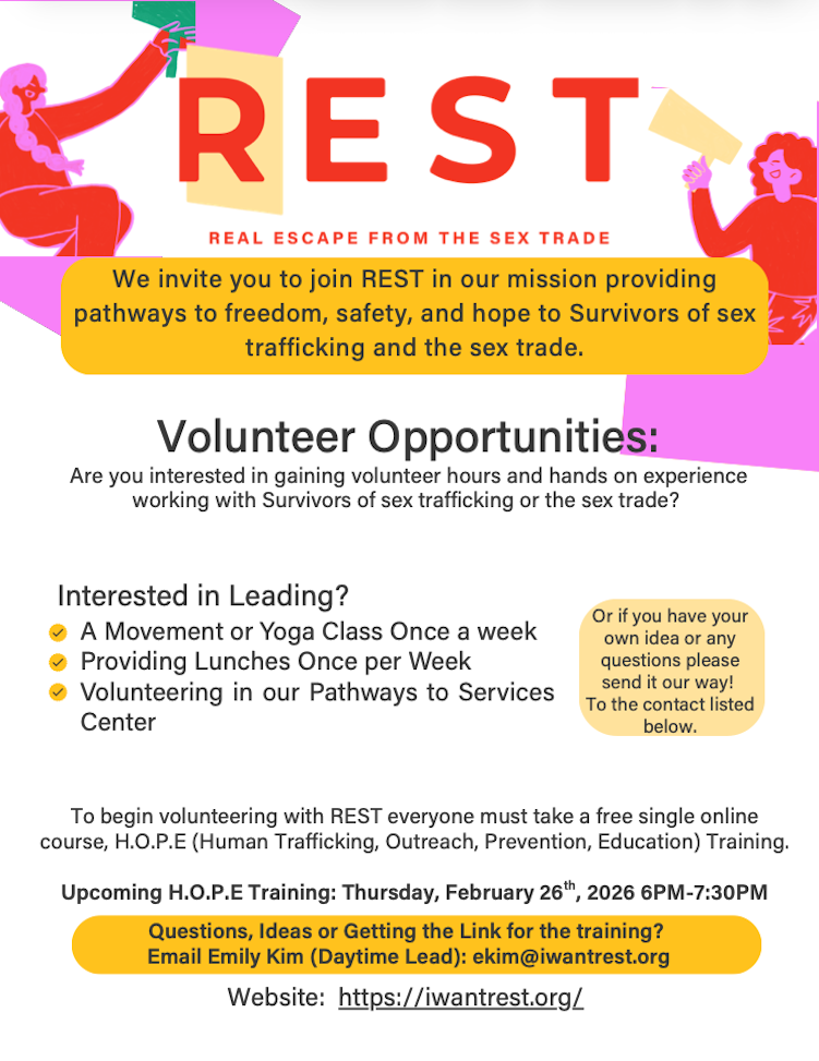 Real Escape from the Sex Trade (REST) invites you to join them in their mission to provide pathways to freedom, safety, and hope to Survivors of sex trafficking and the sex trade. Please see below for more information on how to get involved.